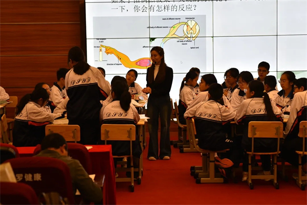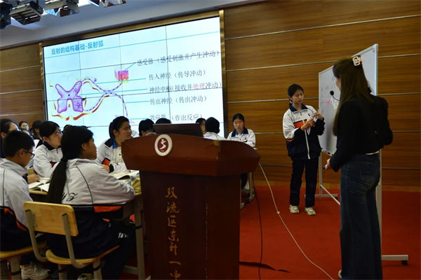 活动伊始,来自棠湖中学实验学校的雷晓双老师率先执教。雷晓双以“神经受损”为核心情境贯穿全课,引导学生通过“阅读—归纳—建模”的方式自主建构反射弧概念。尤为亮眼的是,她创新地将物理电路模型引入生物学课堂,让学生借助电路元件搭建反射弧结构,实现了跨学科融合的实践探索,有效突破了抽象概念的认知难点。