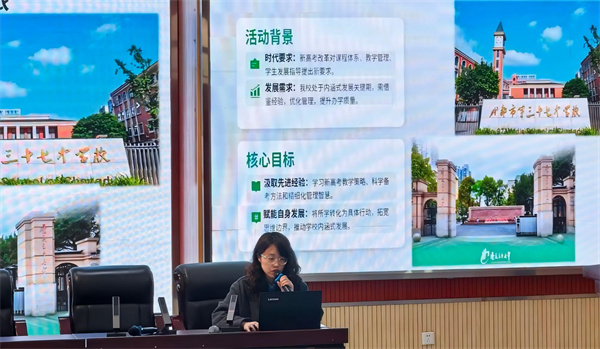 在会议室,高三教学主任程刚老师围绕“新高考改革及备考策略”进行了主题分享,内容详实、案例丰富,为学校高三教学提供了宝贵经验。随后,高一年级主任冉春华老师就“年级管理实践经验”与大家进行了深入交流,现场互动热烈,启发良多。