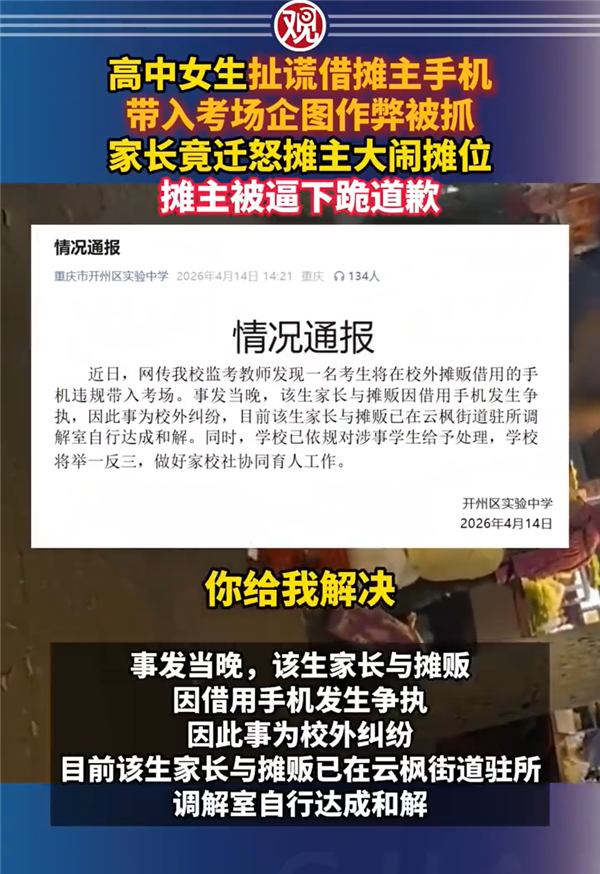 4月14日,重庆市开州区实验中学发布情况通报,事发当晚,该生家长与摊贩因借用手机发生争执,因此事为校外纠纷,该生家长与摊贩已在云枫街道住所调解室自行达成和解。