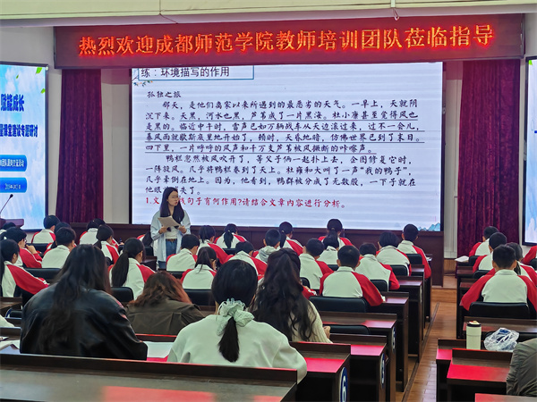 为深化教学改革,促进校际教研互鉴,赋能教师专业成长,2026年4月21日,崇州市崇庆中学实验学校迎来成都师范学院教师培训团队,开展以“聚焦课堂实效,赋能专业成长——教学实践与课堂质量双向提升研讨”为主题的校际交流活动。来访团队全体成员、崇庆中学实验学校党总支专职副书记朱向东、教师发展中心主任童宇及全体语文教师共同参与活动。