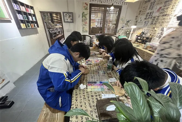 在非遗体验环节,同学们亲手制作漆扇、体验螺钿镶嵌、尝试传统拓印,在指尖流转中触摸传统技艺之美,聆听传承人坚守匠心的故事,深刻体会精益求精的工匠精神与代代相传的文化根脉。