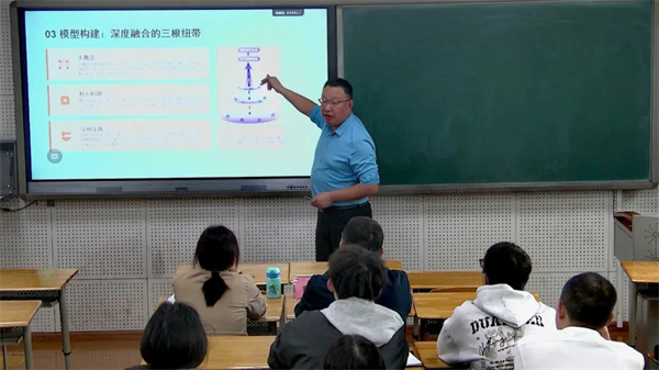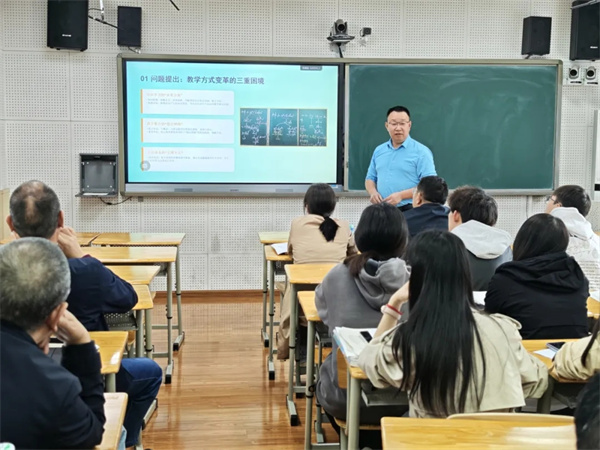 党委专职副书记、高三数学老师吴乐军从单元教学理论建构出发,带来《指向高阶思维培育的单元整体教学理论重构》专题讲座。他深度阐释了单元整体教学的三大核心内涵:目标整合、途径融合、素养整体生成。同时,他进一步阐释了以“大概念”为引领的潜能教育整体教学模型,强调打破单一课时壁垒,将碎片化知识融入完整的思维体系进行系统化教学,助力学生高阶思维发展。