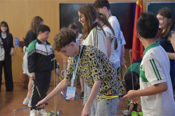 中法同心传文脉,教坛携手育新人。非遗体验环节中,明湖中学精心设置抖空竹、舞龙两项中华优秀传统文化非遗体验课程,为法国师生搭建零距离感悟中华民俗文化的优质平台。法国学子兴致盎然、积极参与,在学校伍履中老师的专业悉心指导下,逐步掌握传统民俗技艺要领,体悟传统民俗文化底蕴。大家在协作互动中凝聚合力,在欢声笑语中真切感悟传统文化传承内涵与匠心精神。
