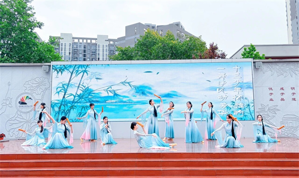 舞蹈《书香盈袖,墨舞芳华》悠然登场。舞者身姿温婉灵动,水袖翻飞间复刻古时书生执笔研墨、静心品读的雅致模样。一招一式融诗词意境,一颦一笑藏书卷风骨,将千年笔墨情怀、古今书香气韵尽数融入舞姿,让在场师生沉浸式感受传统文化独有的浪漫与底蕴。