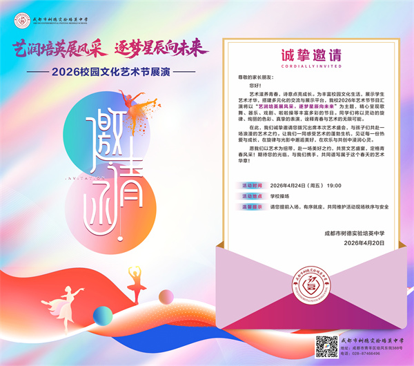 晚风送爽,星光为伴。4月24日晚,成都市树德实验培英中学校园操场灯火熠熠,以“艺润培英展风采,逐梦星辰向未来”为主题的校园文化艺术节汇演盛大启幕,全校师生、嘉宾及家长代表近3000人,共赴这场青春与艺术的璀璨之约。