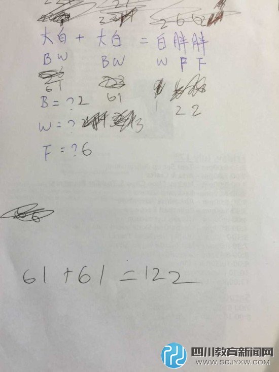 可是不行呀,9岁的孩子了,这样笑,会打击他的自信心的。好不容易止住了笑,想给他解释一下,大、白、胖这里各代表一个数字,我这才发现,这个小小的等式里,竟然3个数字都是未知数,如此抽象的概念,儿子处理不了。我决定等会空下来,拿纸笔写下来,再来对付。