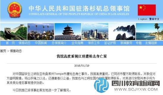 中国驻美国洛杉矶总领事馆网站19日发布消息,称对中国留学生江玥在美国亚利桑那州坦佩市遭枪击身亡事件,表示“高度重视”。