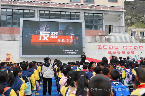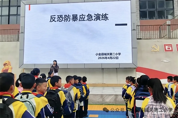 为切实提升校园应对突发恐怖袭击的应急处置能力,增强全体师生的安全防范意识,牢牢筑起校园安全屏障,2026年4月22日上午,小金县城关第二小学组织了一场紧张有序的校园反恐防暴应急演练。本次演练模拟了“恐怖分子”企图强行闯入校园的突发情景,全面检验了学校应急预案的科学性以及各部门的协同作战能力。