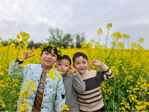 活动当天,微风轻拂,大片油菜花田宛如金色海洋,层层叠叠的金黄花瓣在阳光下熠熠生辉,空气中弥漫着淡淡的花香。抵达目的地后,老师先带领孩子们开启趣味游戏,设计了“花海寻宝”“打地鼠”等互动游戏,将春日元素与游戏规则巧妙结合。游戏结束后,迎来了孩子们最期待的“春日打卡照”环节。孩子们三三两两结伴,在金黄的油菜花田前摆出各种可爱姿势。老师们纷纷拿起相机,定格下这一张张充满童真的笑脸。活动最后,老师组织孩子们开展“春日分享会”,有的孩子说“油菜花田像金色的地毯”,有的孩子表示“今天玩得特别开心,想把春天画下来”。随后,师生们一同整理物品,有序返程,本次春游实践活动在欢声笑语中圆满落幕。
