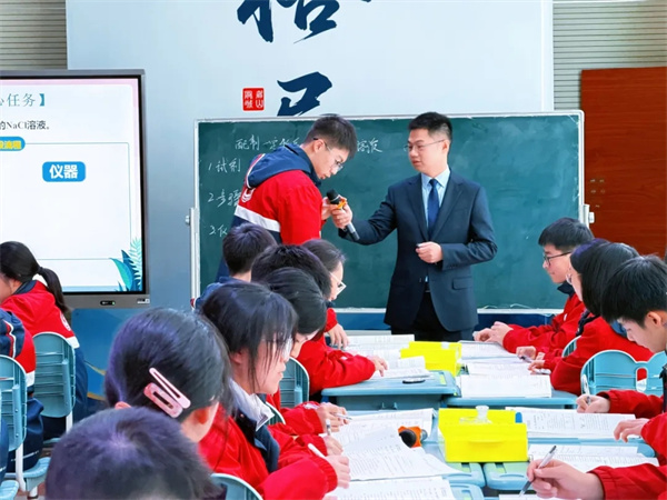 高中化学老师吴丰豆的《配制一定物质的量浓度的溶液》一课,从生理盐水浓度的生活常识切入,制造“精确配制”的认知冲突。课堂结合实验操作与理论讲解,借助AI技术深化学生对容量瓶的认知,将课堂主动权交给学生,引导自主思考解决问题,充分体现科学探究的严谨性与趣味性。