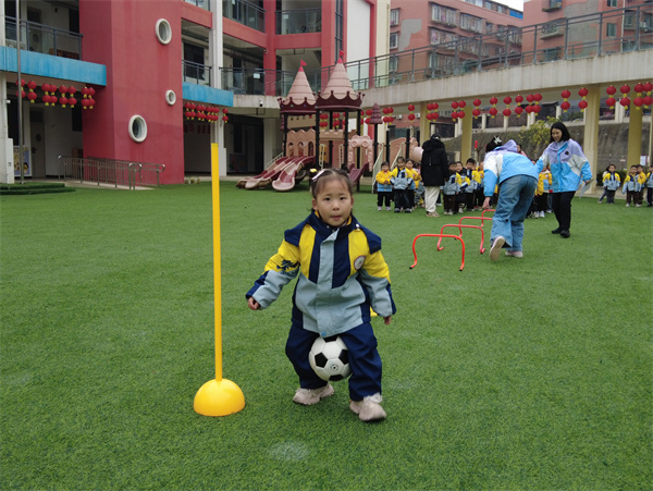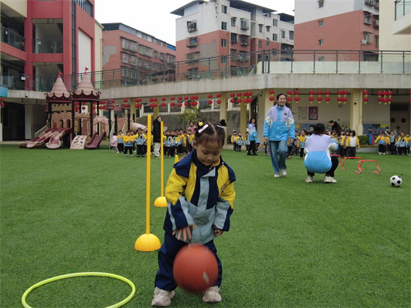 紧随其后的中班萌娃们丝毫不怯场,跨栏、夹球绕杆、拍球等项目轮番上阵,这些项目精准契合中班幼儿平衡能力与动作控制的发展需求。