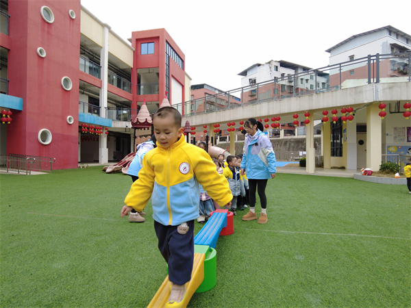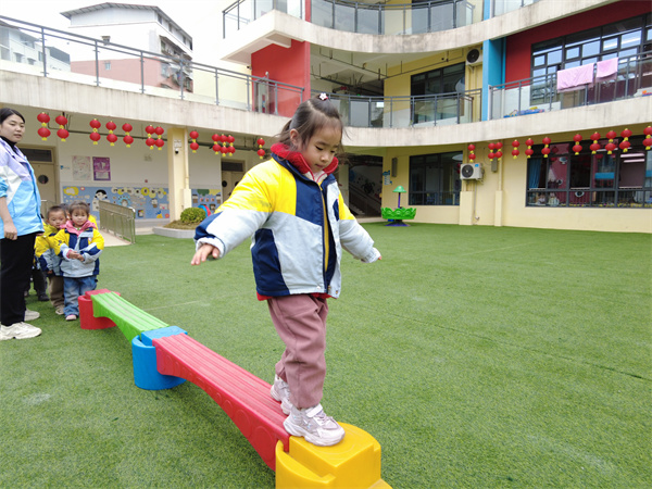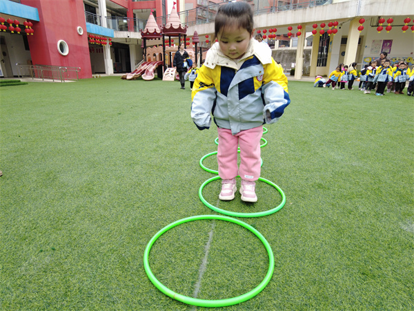 最后登场的是小班的萌娃们。走过独木桥、跳跃呼啦圈、投掷“打怪兽”等充满童趣的游戏,非常符合小班幼儿的身心特点。在轻松愉快的氛围中,孩子们勇敢地尝试每一个游戏,没有紧张与胆怯,只有纯粹的快乐,尽情享受着集体运动带来的美好时光。