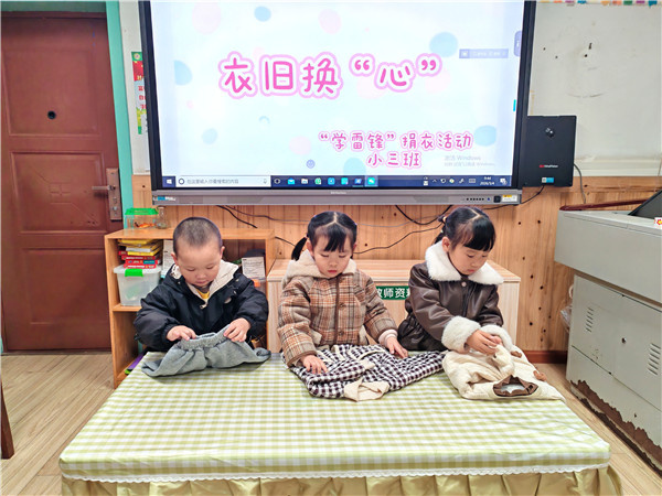 立雷锋志向,做时代新人。各班积极开展形式多样的学雷锋实践活动:孩子们主动参与班级劳动,认真擦桌子、扫地,以实际行动美化环境,在劳动中践行雷锋精神。主动关心、帮助小班弟弟妹妹,用爱心与责任传递温暖。家园携手开展亲子学雷锋行动,带领幼儿参与垃圾分类、文明出行,主动搀扶老人过马路,将雷锋精神融入日常生活。小三班还开展了“衣旧换心”公益活动,鼓励幼儿将家中干净的闲置衣物带到幼儿园,整理打包后通过旧衣回收渠道捐赠给贫困山区儿童,以小小善举传递大爱,让奉献、友爱、互助的雷锋精神在孩子们心中生根发芽。