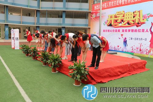 四川教育新闻网成都9月2日讯(林蔚 贾元东)9月2日,成都市红花学校于上午9:00举行了盛大的开学典礼。伴随着庄严的国歌和冉冉升起的国旗,在全体师生和一年级家长的见证下进行了以“践行社会核心价值观 做有梦想的红花人”为主题的开学典礼。 活动伊始,近300名一年级新同学与家长手牵着手,在同学们热烈的掌声中走进了红花学校的“梦想之门”,开启了孩子对新学校、新的人生阶段的美丽梦想。一年级的孩子们和家长朋友们一起走过红地毯,穿过这道梦想之门。从这一刻起,他们一起开启了新的征程——求学之路、成才之路。这道门就是一个崭新的起点。在这道门里,他们要学会求知,学会生存,学会独立,学会自主,学会共处,学会感恩。