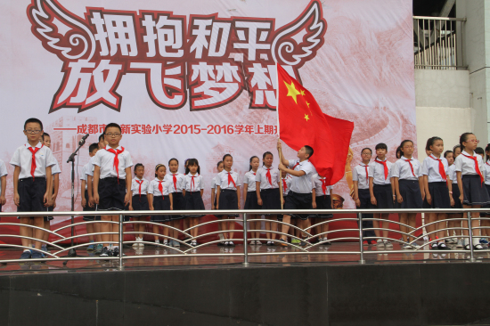 “起来,不愿做奴隶的人们……9月1日,伴随着嘹亮的国歌声,仰望着庄严的五星红旗,北新实小新学期“拥抱和平放飞梦想”开学典礼正式拉开帷幕。
