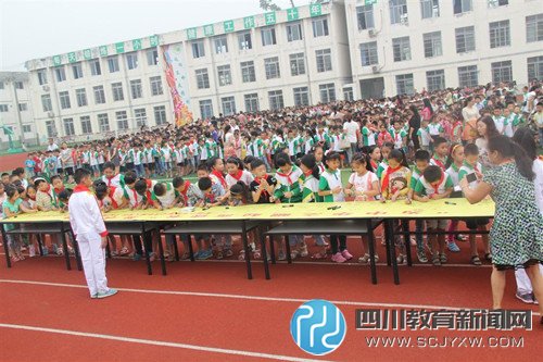 开学典礼上,升旗仪式庄严有序,国旗冉冉升起;学生代表围绕抗日战争暨世界反法西斯战争胜利70周年主题做了新学期国旗下讲话。随后,夏可玉校长上台致辞,对刚进入彭镇小学学习的一年级小朋友表示热烈的欢迎,在“回顾历史,展望未来”中对我校全体师生提出新学期的新要求、新希望。大队部倡议、师生国旗下宣誓、“为中华之崛起而读书”的签名活动,一次次的触动着在场的师生,并将活动推向高潮。