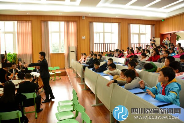 四川教育新闻网成都11月18日讯 2015年11月17日下午,爱乐乐团走进了成都市营门口小学校,他们给师生们带来了一场音乐大餐。他们弹奏了《大海啊故乡》、《化蝶》、《小步舞曲》、《天空之城》、《天鹅湖》等曲目,受到了师生们的喜爱,期间演奏者们和学生的互动,更是让孩子们对音乐有了更多的理解。