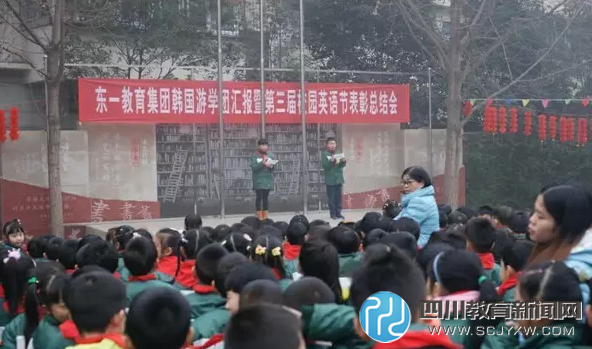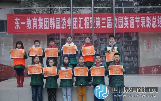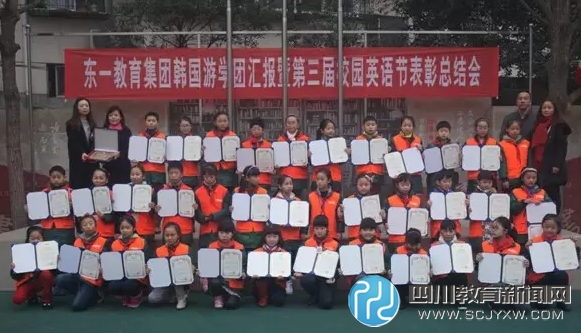 四川教育新闻网成都1月6日讯 为了进一步推进素质教育,深化新课程改革,激发学生对英语学习的兴趣,提高学生英语的听、说、读、写能力,1月4日,东一教育集团赴韩游学团汇报暨第三届英语节表彰总结会隆重地拉开了帷幕。