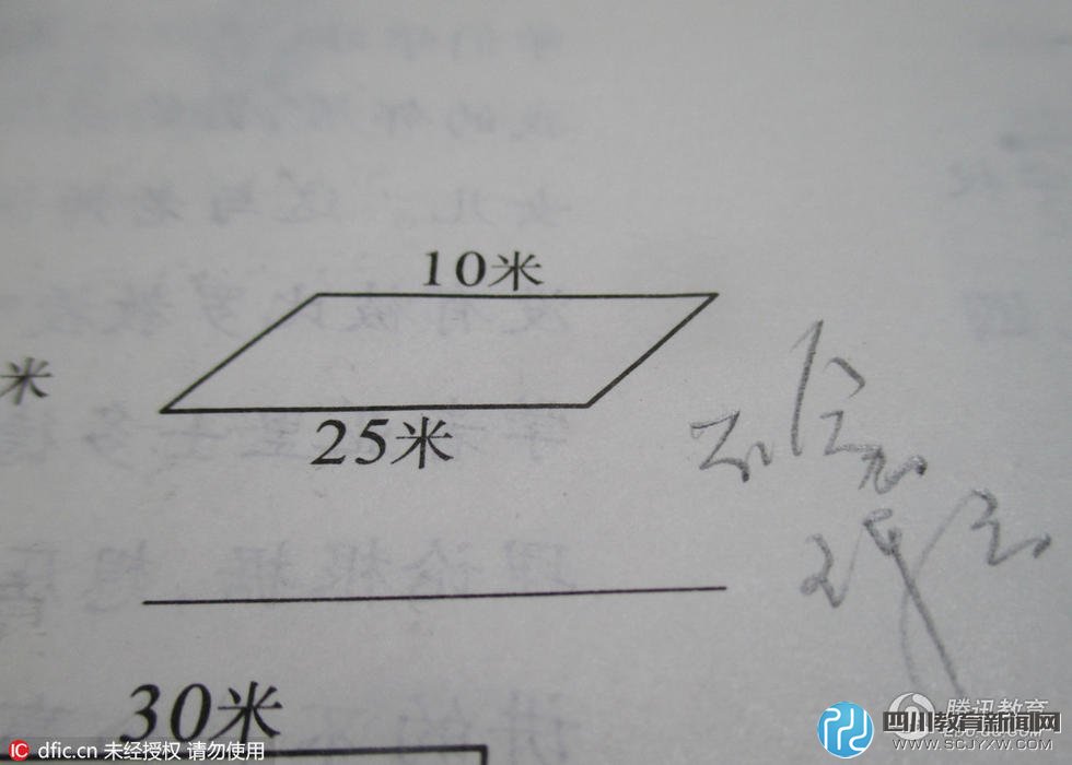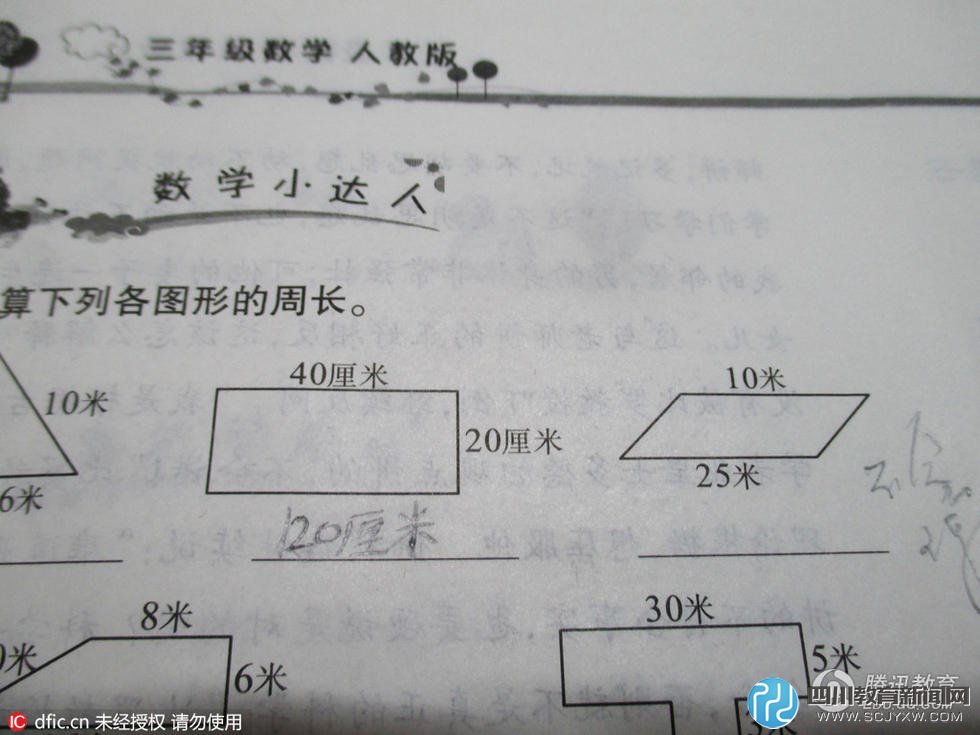 安徽安庆小学老师要求学生假期作业认真完成,不会的由家长辅导,否则,开学后,学生将受批评。三年级有一道题,计算一个“平行四边形”的周长,一条边长25米,对边长10米,不少家长也“不会做”,只得签字,证明自己已经辅导,并请老师谅解和作答。 |