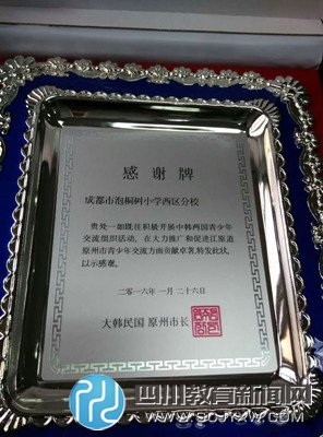 四川教育新闻网成都3月14日讯(易彬)3月14日,早上8时30分,成都市泡桐树小学西区分校全体师生依次来到操场,做好升旗仪式的准备,同时四川电视台《阳光起跑线》的制片人易彬老师也带着由韩国原州市市政府委托送给学校的感谢牌也来到了现场,感谢学校在国际学游方面做出的突出贡献!