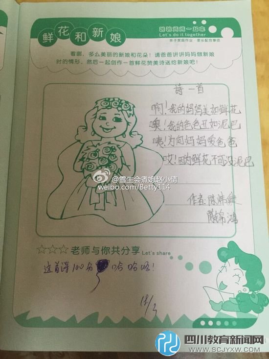 9日,一首网传为杭州小学生写的小诗在网上爆红,短短四句,却让无数网友笑到飙泪。 诗曰:“啊!我的妈妈美如鲜花。噢!我的爸爸丑如泥巴。咦!为何妈妈爱爸爸。哎!因为鲜花不能没泥巴。” 10日,华西都市报记者了解到这首诗真正作者是广州的一位家长,是在帮3岁儿子完成幼儿园布置的家长作业时写的。“一两分钟就完成了,没怎么经过大脑。”这位家长说,他们一家曾计划来成都,但都没成行,希望不久后能带着孩子来成都看可爱的大熊猫。 网络爆红 “妈美如花爸丑如泥巴”传为小学生所作 “啊!我的妈妈美如鲜花。噢!我的爸爸丑如泥巴。咦!为何妈妈爱爸爸。哎!因为鲜花不能没泥巴。”近日,这首“损爸夸妈”的小诗在网上爆红。因诙谐幽默,该小诗在网上引发热议。 后有杭州媒体称,这首小诗是杭州德天实验小学二年级的学生所作。如此一来,数以万计的网友在网上排队夸这位小朋友“有才”。 记者在网上找到了这首诗的图片,题目为“诗一首”,字迹工整,看不到作者名字。记者注意到,在网上传播这首诗时,很多人都会提到一个名为“BBgirl-LightRain”网友的名字,称是这位网友最先发布这首诗是杭州德天实验小学二年级所作。 剧情反转 小诗是广州一位家长所作 老师批了100分 就在这首小诗在网络上热传时,9日晚上10点过,网友“BBgirl-LightRain”在其微博上发布了一则致歉。她说,“关于那首我的妈妈像鲜花的诗,是同事朋友圈里开的玩笑,我未经核实发布,向原作者及网友致以最诚恳的歉意!”同时,该网友已经删除了之前的所有微博内容。 10日上午,广州的一位赵女士告诉华西都市报记者,她是广州白云区三之三时代幼儿园小班的老师,这首诗是她的一位学生家长完成的亲子作业,当时得了100分。早在3月25日,她觉得有意思就已经发到自己朋友圈,“当时并没有这么火,只有10几个赞和60多个评论。” 9日晚上,她突然在网上看到这首诗,还说是杭州一位小学生所作。“我觉得不大可能,因为连标点在内,一字不差,而且字迹也相同。”赵女士说,她看到网上图片后可以肯定是有人弄错了。随后,她又联系上网友“BBgirl-LightRain”核实,于是才有了该网友公开致歉,“这位网友还让我向原作者转达歉意,其实没什么,更正一下就行了。”赵女士说,她见过这位爸爸几次,挺幽默的,甚至还有朋友劝他开一档脱口秀栏目。 亲子作业 写诗只用了一两分钟 妻子称“狗屁不通” 10日中午,根据赵女士提供的联系方式,华西都市报记者联系上了这首小诗的原作者陈炜健,他自称是广州的一位个体户老板,开了一家公司。他告诉记者,这是幼儿园给他儿子陈锦鸿布置的一道亲子作业,因为儿子还不会写字,因此要由家长帮忙。 陈炜健说3月13日左右,幼儿园老师给学生和家长布置了一道看图作诗的题目。“看图,多么美丽的新娘和花朵!请爸爸讲讲妈妈做新娘时的情形,然后一起创作一首鲜花赞美诗送给新娘吧!” 当天,陈炜健拿到这道题后,当即写下了这首小诗,“一两分钟就完成了,基本上没经过大脑。”陈炜健说,这首诗是有现实基础的,他的妻子很漂亮,平时在家里都是妻子说了算,他就写了这首小诗,一方面是完成作业,一方面有点“自黑”的意思。 9日晚上,他们一家在吃饭的时候,妻子在网上看着这首诗已经爆红了。“她当时还跟我开玩笑,你这狗屁不通的诗居然这么火了。”陈炜健说,直到这时,他才知道自己的作业被当作小学生写的诗,在网上热传,“可能是因为我字写得不大好看吧”。 此外,陈炜健听说记者来自成都,称之前曾多次计划带着孩子来成都游玩,但均未能成行,下次一定要找个机会到成都,带小朋友看看熊猫。 对话当事人: 老婆在我心里最美 但就是对我太严了 华西都市报:平时幼儿园的家长作业,你做的多,还是你妻子做的多? 陈炜健:基本上都是我做,老婆安排就行了。我当学生的时候,都没这么努力过。 华西都市报:得知你的作为,被传为一位杭州小学生所作,当时生气吗? 陈炜健:说真的,当时有一点生气。虽然我这也算不上什么作品,但是谁写的就是谁写的,套在别的孩子身上,我觉得也不利于孩子的健康成长。 华西都市报:写这首诗的创意怎么来的? 陈炜健:没什么特别的,来源于生活嘛。在我心里,老婆确实是最美的,但管我管还是管得太严了。