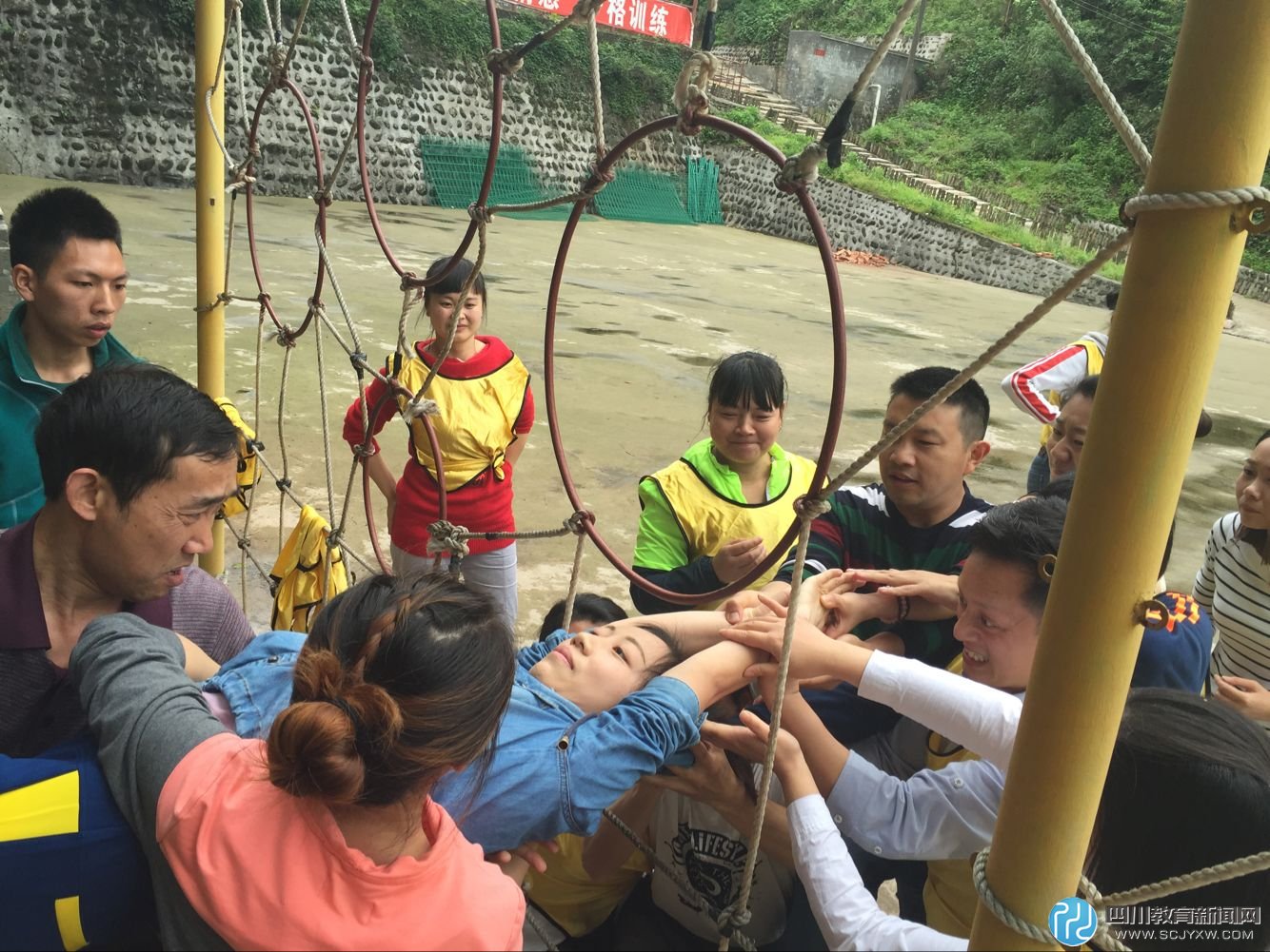 待一切准备就绪后,第一个拓展项目就开始了。这个项目的名称叫做“信任背摔”。“信任背摔”这是拓展训练中最具典型意义的项目之一。要求背摔者站在1米7左右的跳台上直挺挺地向后倒下,于此同时在台下方的同事会用手托起成一个“人床”把台上摔下的人接住。在活动中,要求老师们轮流为背摔者搭起“人床”,虽然有的老师的手臂已经被背摔者砸得有些麻木了,但是丝毫没有退缩的情绪,男老师们更是一直甘当“人床”,体现出了男教师们温情的一面。“信任背摔”这个项目锻炼老师们的心理素质,使老师们克服了心中的恐惧,充分建立起了老师们的信任关系。