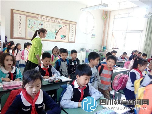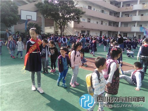经书不厌百回读,熟读深思子自知,学校长期坚持开展的“与圣贤为友,与经典同行”的国学经典诵读让幼儿园的萌娃们看呆了,大哥哥大姐姐朗朗上口、韵味十足的晨诵让孩子们非常羡慕,跃跃欲试,久久不肯离开。学校还为这些孩子准备了国学经典阅读读本,相信这些有兴趣的孩子们的国学知识也会日积月累,成为仁义敦厚和高尚的人格的人。 (二) 庄严肃穆的国旗下少先队活动有的新鲜。 今天的少先队活动主题是环保,哥哥姐姐真棒,他们列队整齐,神情专注,在庄严肃穆的升旗仪式后,4.3班的少先队员们来到舞台上。在她们生动有趣的故事表演中,深入浅出地学到了怎样保护地球、保护自己的知识。 (三)川西民俗体育大课间活动真正有趣。 操场上,排列有序的方阵,首先进行了国学操的展示,我们也能跟着比划比划;紧接着,各方阵开始了民俗体育活动,有跳皮筋的、跳长绳的、滚铁环的、踢毽子的、抖空竹的......我们最喜欢的是抖空竹,哥哥姐姐有几十种手法,看的我们眼花缭乱,我们以后也要向他们一样。