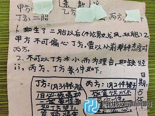为二宝降临做准备 女儿拟《二胎合同》排演未来但近日,当小雪拿着一份自己手写的《二胎合同》要求爸爸妈妈签字时,王女士才发现女儿其实已经为二宝的降临做足了准备。 记者看到,这份合同规定由甲乙丙丁四方签署,分别代表父、母、小雪和未来的弟弟或妹妹。条款规定大致如下:1.生了二胎以后(无论男女、龙凤、双胞胎),甲方乙方不可偏心丁方,要以从前那种态度对待丙方。2.不可以丁方太小或经济不宽裕为由,克扣丙丁双方的吃穿用度。该条款下具体拟定了衣服、喝奶和饮食要求,如丁方每月3件衣服,每天必须喝奶,哭了爸妈必须安抚;自己作为丙方,每月2件裙子,饭食饮水不可少一件,自己可以照顾弟妹,不可偏心。以上条款经过签字,必须兑现承诺。合同期限为2016年~2101年。甲乙丙丁四方分别留有签字、盖章的空格,其中丙方的签字和盖章(图画)已签署完毕。 “我和老公看到这份合同,先是觉得很搞笑,仔细阅读后才理解了女儿的用心。”王女士感慨地说,可以看出,女儿一定准备了很久,才想到这些条款,虽然看起来比较幼稚,但也反映出她既期待有弟弟或妹妹,又担心父母偏心的矛盾心态。女儿已经在心中排演了未来的生活场景,通过这番排演,一旦小弟弟或小妹妹降临,即使一时有点失落,小雪依然能够从容应对家庭新成员带来的改变,会逐渐习惯自己的角色,她肯定会是一个好姐姐。 “我们肯定会签订这个合同的。”王女士告诉记者,为让女儿放心,我们会履行承诺。今后有了二娃,也许生活上会多照顾一点小的,但绝对不会冷落大女儿,要让她真真切切感受到父母对她的爱没有改变。 女儿说