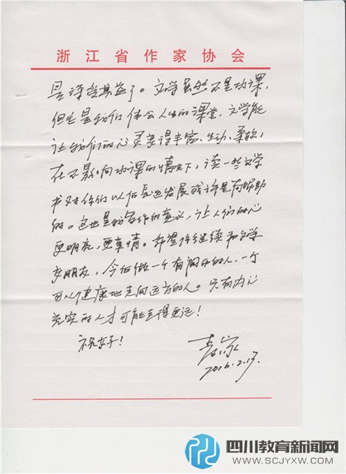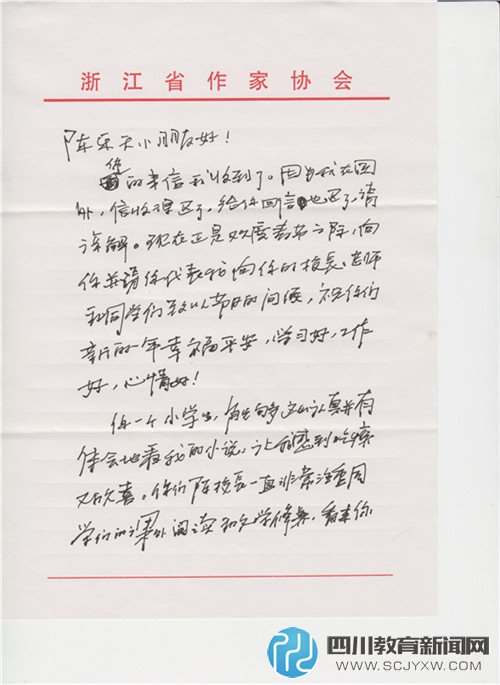 四川教育新闻网成都5月24日讯(赖波) 5月24日,六一前夕,东城根街小学学生陈乐天收到了浙江省作家协会主席、茅盾文学奖获得者、中国当代著名小说家、编剧麦家叔叔的亲笔回信。