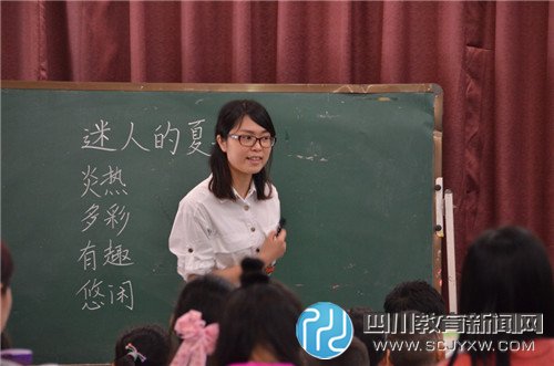 低年级的课在进行阅读教学时除了注重识字教学还很注重学生朗读读能力的培养。张美艳老师执教二年级《迷人的夏天》,就能根据二年级的学段特点,让学生先整体感知课文后,采用随文识词检测的方法,教会孩子们读好词语、短语,教给写字方法,写好“炎”字;采取多种形式的朗读,让孩子们想象画面读、抓重点词读、加动作读层层深入,读好“夏天是有趣的”,直到熟读成诵,迁移说话训练,真可谓环环相扣,水到渠成。老师在课堂上教态大方,游刃有余,孩子们沉浸在语文诗意的课堂中,听得聚精会神,读得有滋有味,写得工整美观,说得绘声绘色。