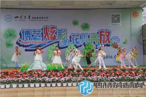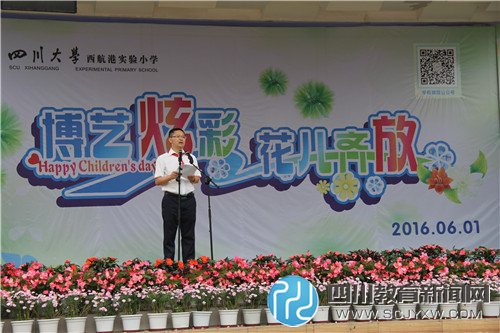 四川教育新闻网成都6月3日讯(贾元东 通讯员 王泉泉) 微风拂面六月天,百花齐放笑声甜。2016年5月31日上午四川大学西航港实验小学校园里彩旗飘扬,到处洋溢着节日的气氛,全体师生沉浸在这美好的日子里,以“博艺炫彩,花儿齐放”为主题的乡村少年宫第五届艺术节庆六一文艺展演在学校操场隆重举行,全校师生及受邀家长共计4000余人参加了此次盛会。