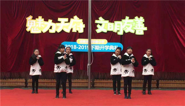 一群可爱的“熊猫宝宝”跳着《天府熊猫闹团圆》的舞蹈,拉开了开学典礼的序幕。孩子们用自己喜欢的方式向大家介绍自己的家乡——天府之国,一块文化流长,人才辈出的文化宝地,热情地传播天府文化。五、六年级组的同学慷慨激昂地诵读《中国少年说》,他们把对祖国的热爱、对理想的追求融入到字里行间,以充沛饱满的感情,自信大方的形象,展现了新华学子的风采,也让全校师生感受到身为中国人的自豪感和使命感。