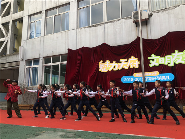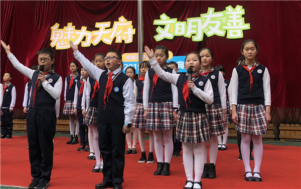 开学典礼以“魅力天府,文明友善”为主题。随着音乐声响起,少先队员们唱着国歌注视着五星红旗冉冉升起。