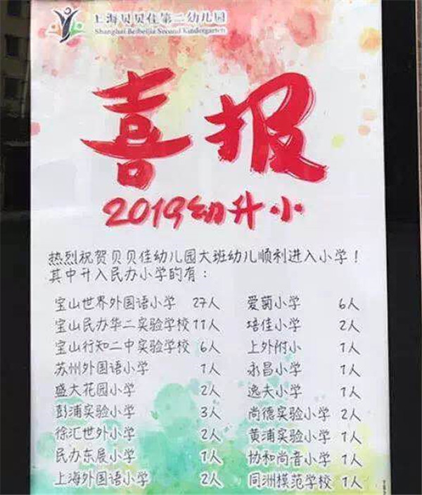 近日,有网友反映,位于上海市宝山区的贝贝佳双语幼儿园张贴“幼升小喜报”,披露大班幼儿进入民办小学的有关信息。