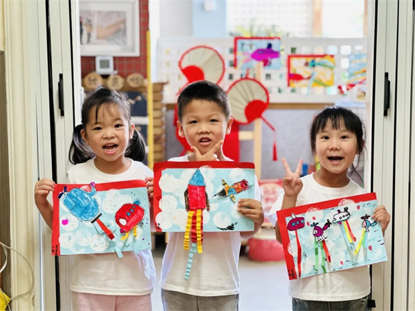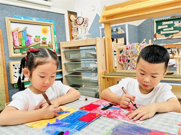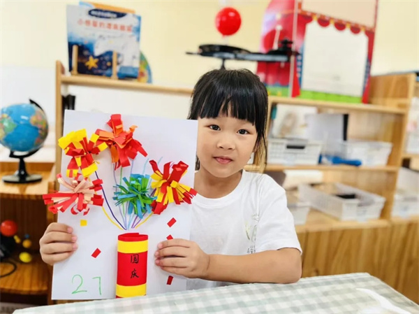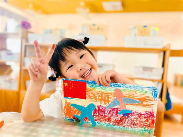 另一边,中大班孩子们则将他们对祖国的爱意融入了手工作品中。他们的创作题材丰富:既有五星红旗、天安门城楼等国家象征,也有在九三大阅兵上见到的战机、坦克、导弹车等现代化军事装备模型——那次盛大的阅兵在孩子们脑海中留下了深刻印记。孩子们专注地剪贴绘制,一件件稚拙却真诚的作品,正是他们献给祖国母亲最珍贵的礼物。