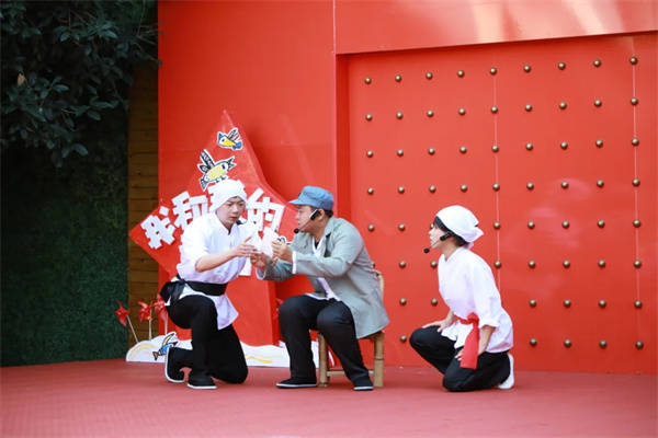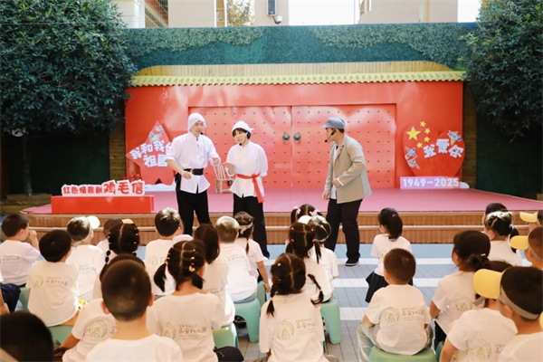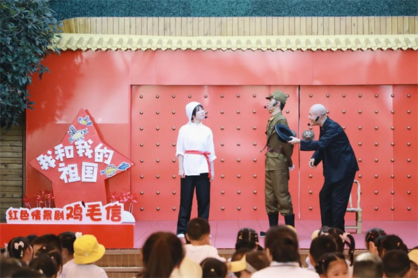 操场上,小观众们翘首以盼的目光,将全场期待值拉满——红色经典情景剧《鸡毛信》终于上演!