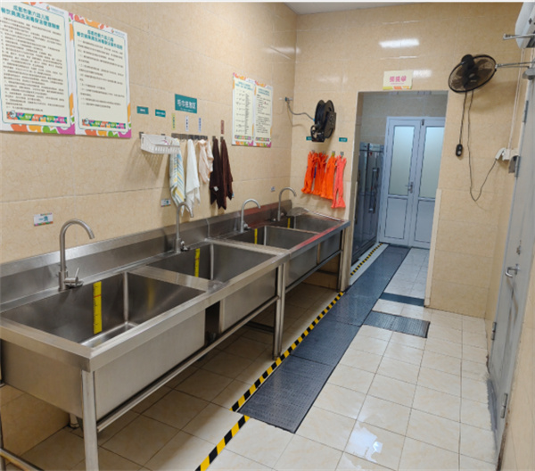 穿戴好一次性衣帽、口罩,经过手部消毒后,我终于走进了幼儿园的“阳光厨房”。眼前的景象彻底打破了我对食堂后厨的固有印象--地面干爽无积水,操作台面一尘不染,工作人员各司其职,每一个环节都井然有序。