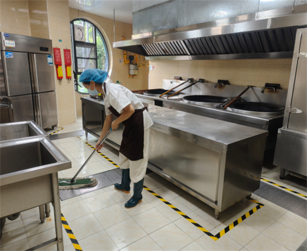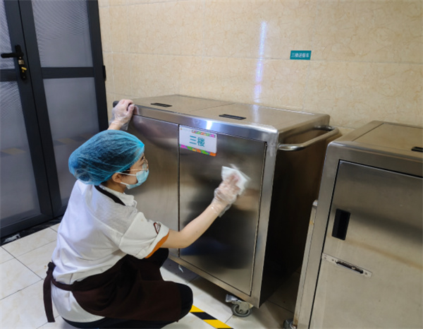 餐具清洁:回收的餐具正经历六步清洁流程:一洗、二清、三消、四冲、五消毒、六保洁。消毒后的餐具整齐摆放在保洁柜中,摸上去干爽温热,“我们每天都会检查消毒柜的运行记录,确保消毒温度和时间达标。”保健医生指着记录册说。