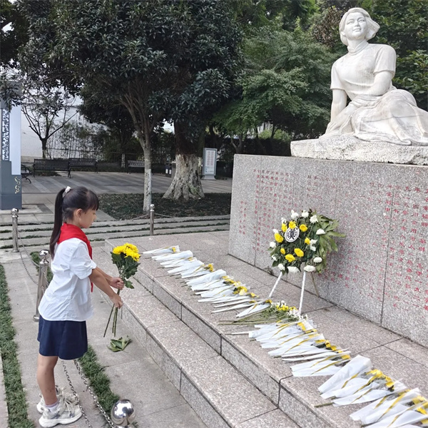仁里小学推动“聆听”与“行走”相结合。学生不仅在家庭场域中聆听父辈讲述崇州本地的红色故事,更通过走进如露萍广场等红色基地进行现场祭奠与缅怀,让历史可触可感。