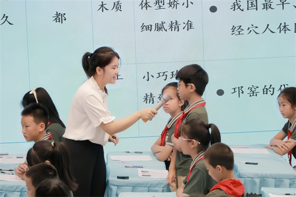 课堂是教育理念落地的核心阵地。茶小清淳分校赵明珠老师带来“群文阅读”课例展示《成博文物推荐官》。课堂上,赵明珠以成都博物馆文物为载体,引导学生在多文本阅读中提炼信息、整合思路,不仅培养了学生的阅读能力与表达能力,更将文化传承与语文素养巧妙融合,生动诠释了“淳美”课程“以美育人、以文化人”的理念,为在场教师提供了极具参考价值的教学范例。