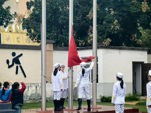 伴随着激昂的出旗乐曲,旗手们迈着坚定有力的步伐,护卫着鲜艳的五星红旗走向升旗台。在雄壮嘹亮的国歌声中,五星红旗冉冉升起,迎风飘扬。少先队员行队礼,全校师生共同表达对祖国的无限热爱与崇高敬意。