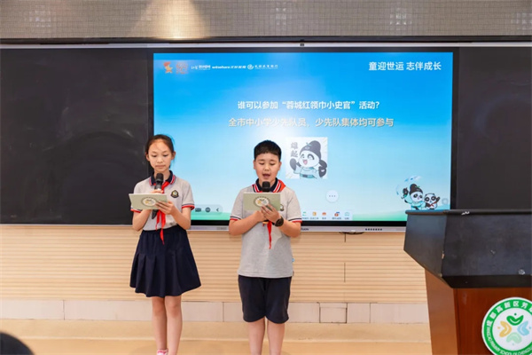 2025年5月7日,成都高新区团工委走进成都高新区芳草小学开展“童迎世运 志伴成长”专题讲座。从古代的蜀汉文明,到近现代的抗战文化,再到现代的都市风情,成都一直以其独特的魅力吸引着世人的目光。芳草学子积极学习家乡历史文化,做成都文明风尚的宣传者和践行者。本次活动由四年级四班周宥廷和四年级五班廖雪漫两位主持人拉开序幕。