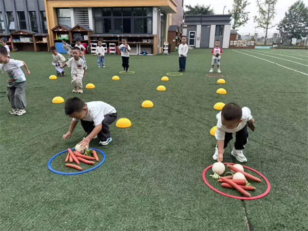 “春种一粒粟,秋收万颗子”。结合秋季丰收的特点,以“秋收”为游戏内容,小、中、大班教师根据幼儿年龄特点,精心设计了“螃蟹背西瓜、松鼠运果子、南瓜大迁徙、红薯大挖掘、玉米高高堆”等精彩纷呈的游戏项目。