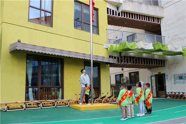 来自中四班的李安泽、周宸扬、魏梦亭、李翊澄4位小小护旗手迈着“小正步”走来。“升国旗,奏国歌,行注目礼!” 随着小主持的声音,国歌轻轻响起。护旗手刘亦林把国旗升上空中,全园小朋友行注目礼。GWe四川教育在线-四川教育讯息