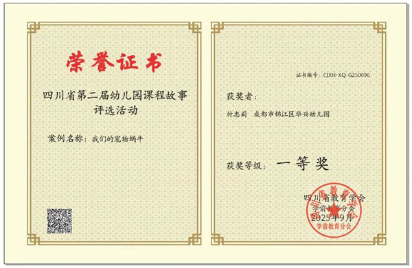 华兴幼儿园,课程故事评选活动,教师获奖在近日落幕的“四川省第二届幼儿园课程故事评选活动”中,成都市锦江区华兴幼儿园的老师们怀揣教育热忱,以专业为笔、以童心为墨,将幼儿园日常的细碎美好凝练成动人故事,从众多参赛课程故事中崭露头角,一举摘得省级一等奖一个、二等奖一个以及三等奖两个。
