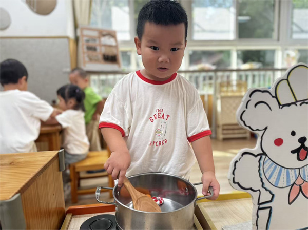 小厨房热闹非凡,孩子们握着迷你厨具“翻炒”仿真食材,你递“蔬菜”我端“汤”,互相分享自制“美食”。