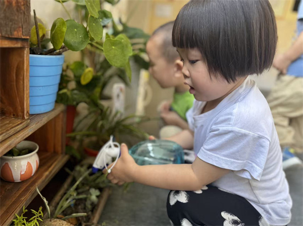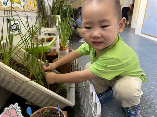 植物角是孩子们的“自然小课堂”,宝贝们在老师引导下观察幼苗的纹路与生长变化。