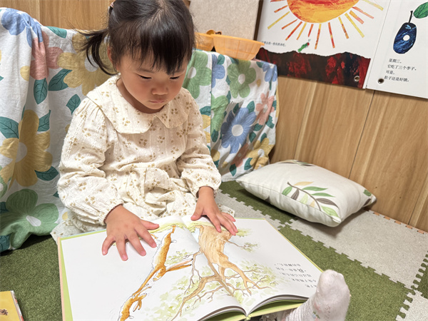 图书区安静又温馨,支持幼儿通过阅读、讲述、表演等多样的活动,发展倾听、表达、前阅读和前书写的经验。