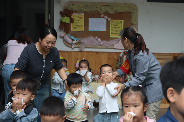 10:00演练正式启动,浓烟升起后,保安谢君山通过广播发出疏散警报,同步上报园长。30秒内,教职工迅速响应:教师引导幼儿捂鼻弯腰撤离,保育员断电断火检查教室,周跃学关闭园区总阀;后勤保障组同步行动,在教学楼门口协助疏导人流,避免队伍拥堵。1分46秒时,所有师幼安全抵达操场,无一人滞留。后续3-5分钟内,各班教师快速清点人数,向总指挥汇报情况。