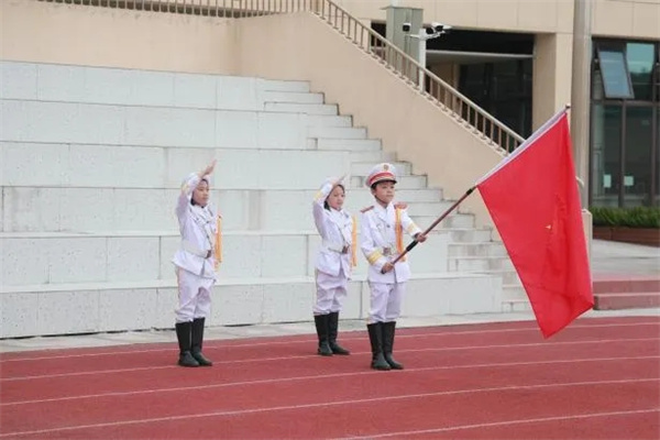 少先队出旗曲响起,旗手护送队旗入场,全体队员敬礼;随后中国少年先锋队队歌响彻校园,韩雨佳老师指挥。
